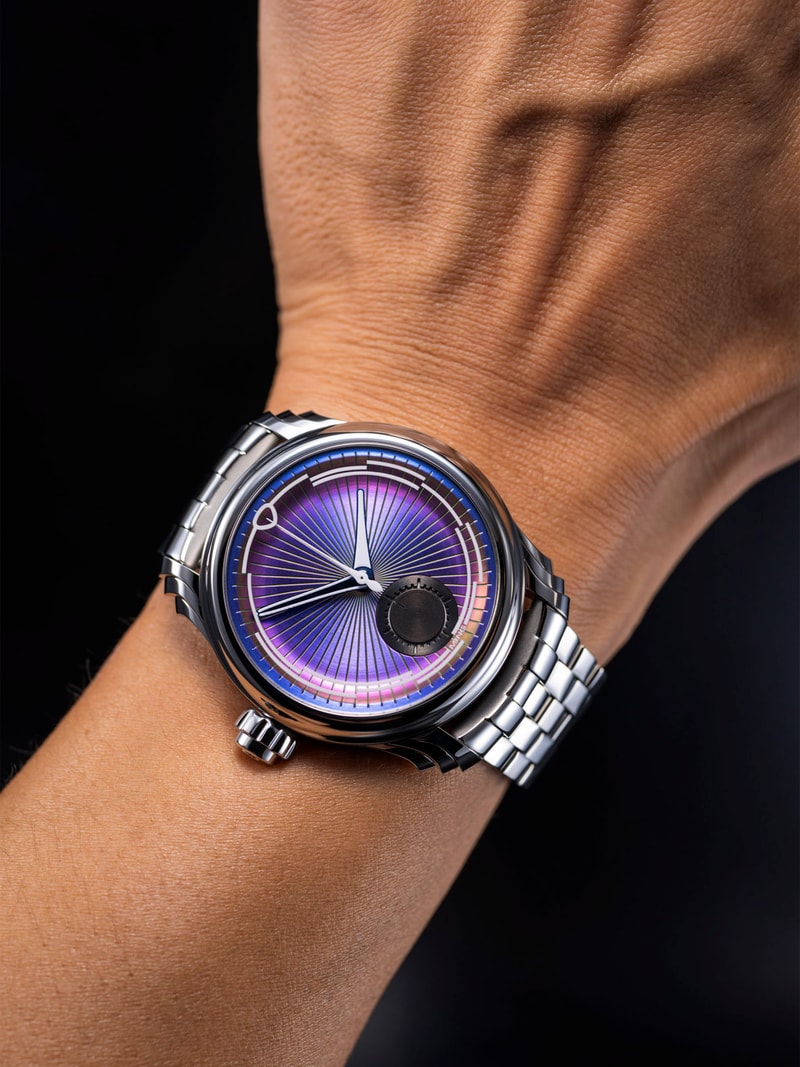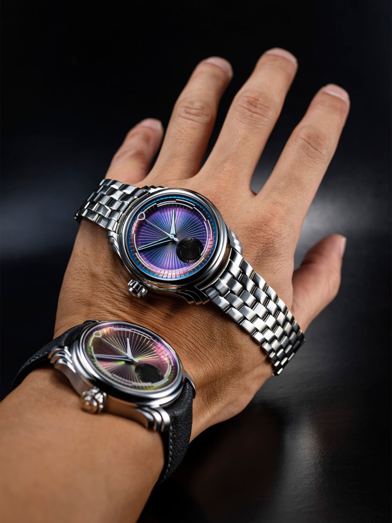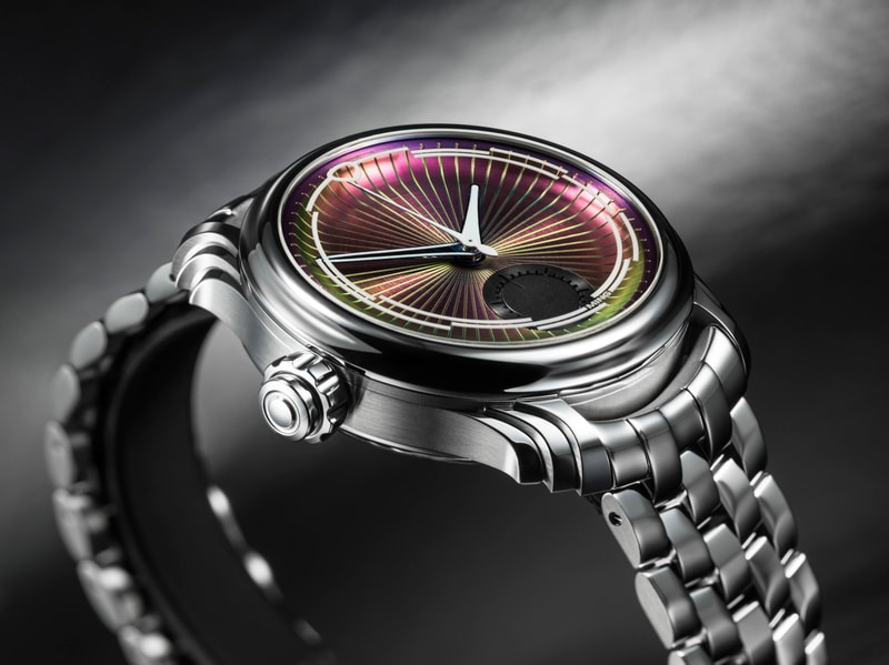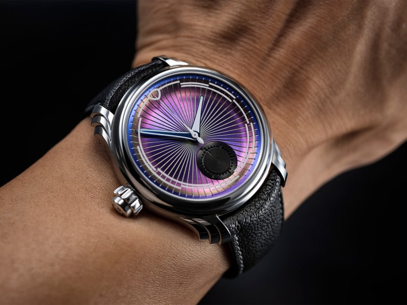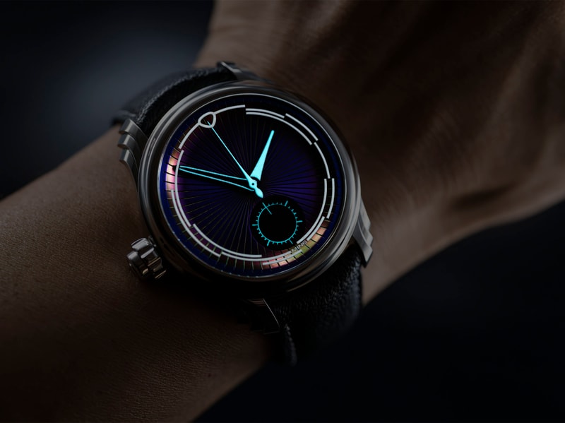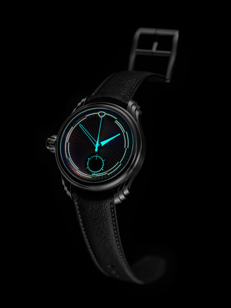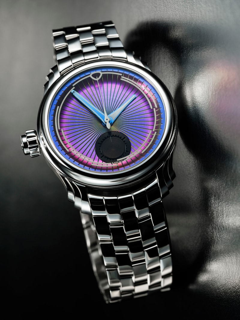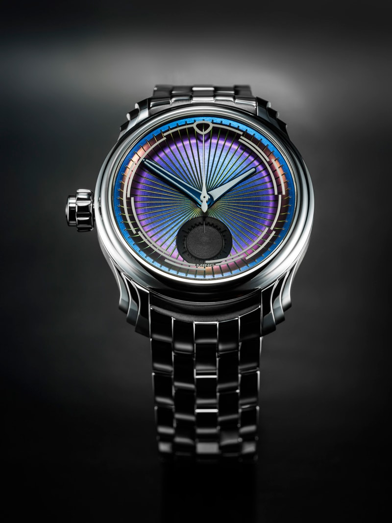 The watch really earns its name on the dial side: it isn’t just the deeply dished and fluted dial that you notice first, nor is it the floating indices, or the uniquely shaped chronograph minute counter disc that has sandwich style construction overflowing with luminous material. It’s the colour of the dial itself that is impossible to define because it’s in a constantly shifting dynamic state between turquoise and purple and all the transitionary shades of blue in between. The effect is achieved with a multiphasic coating over a machined brass base. We call it ‘Iris’ because of its curvilinear radial pattern and the depth, intensity and dynamism of its colour.