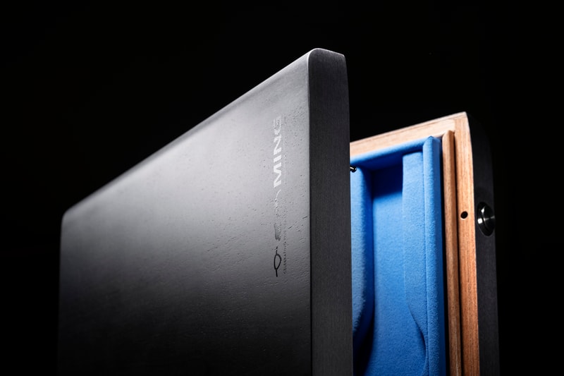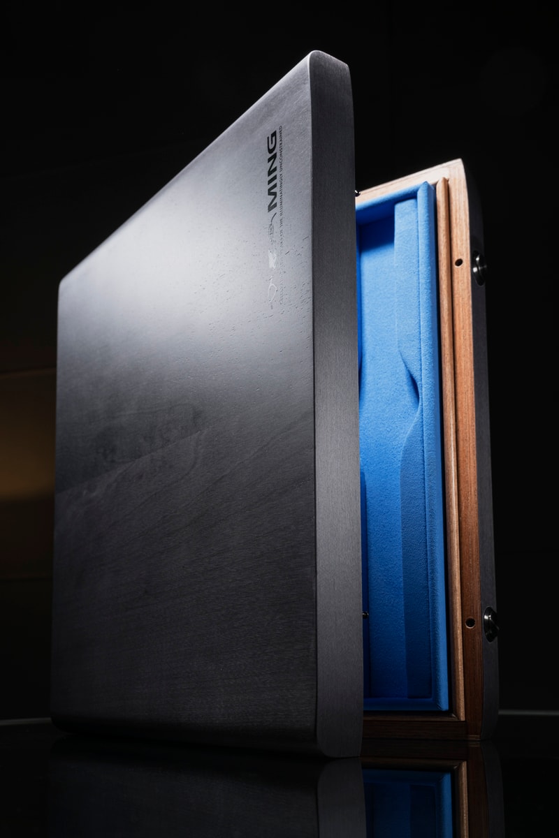 The core of the case is composite Okoumé reinforced with fibreglass for lightness and rigidity. It is then clad in an anthracite maple veneer shared with the Japanese-style puzzle boxes we use for the MING 20.01 Series 2 and other special projects. The interior is precision cut high density foam, wrapped in royal blue microfibre suede. Each watch slot will fit a watch up to 43mm in diameter.