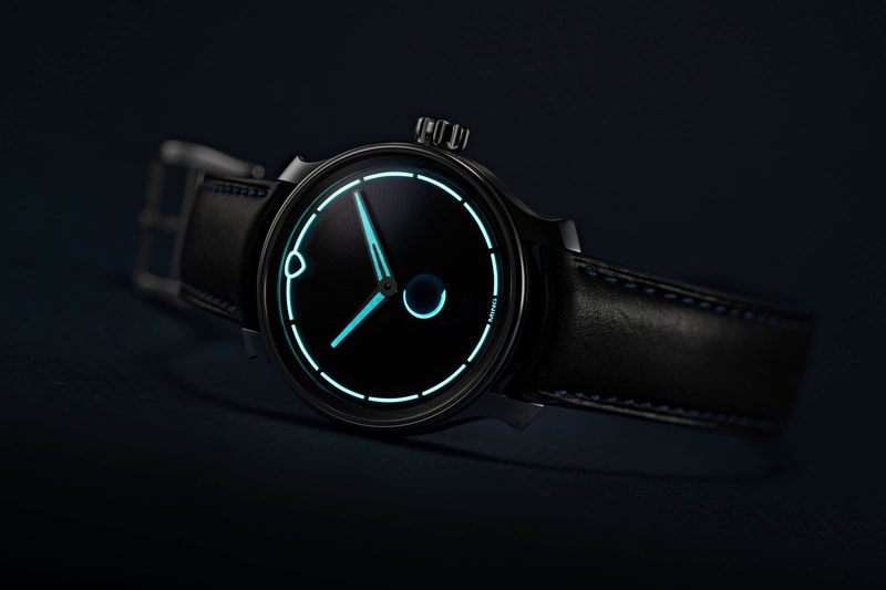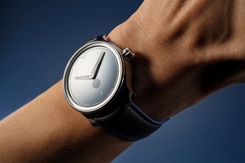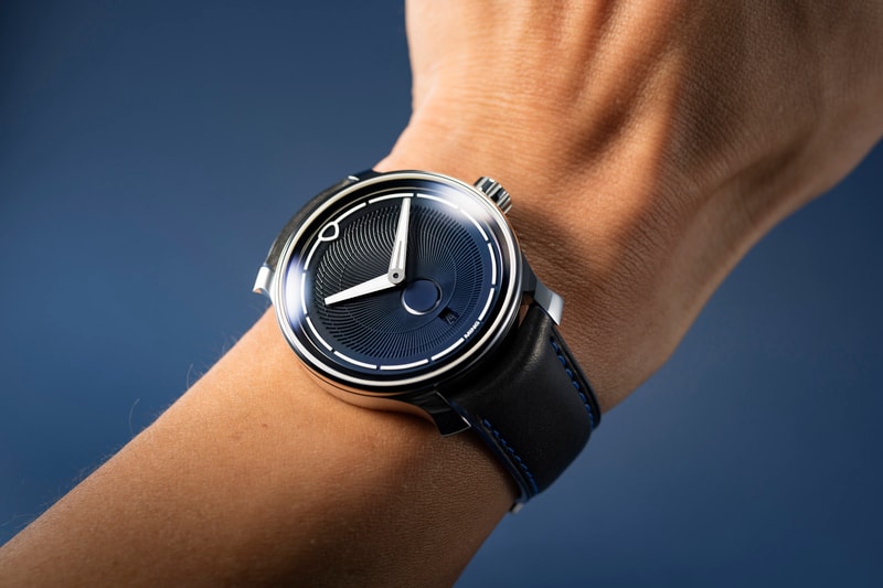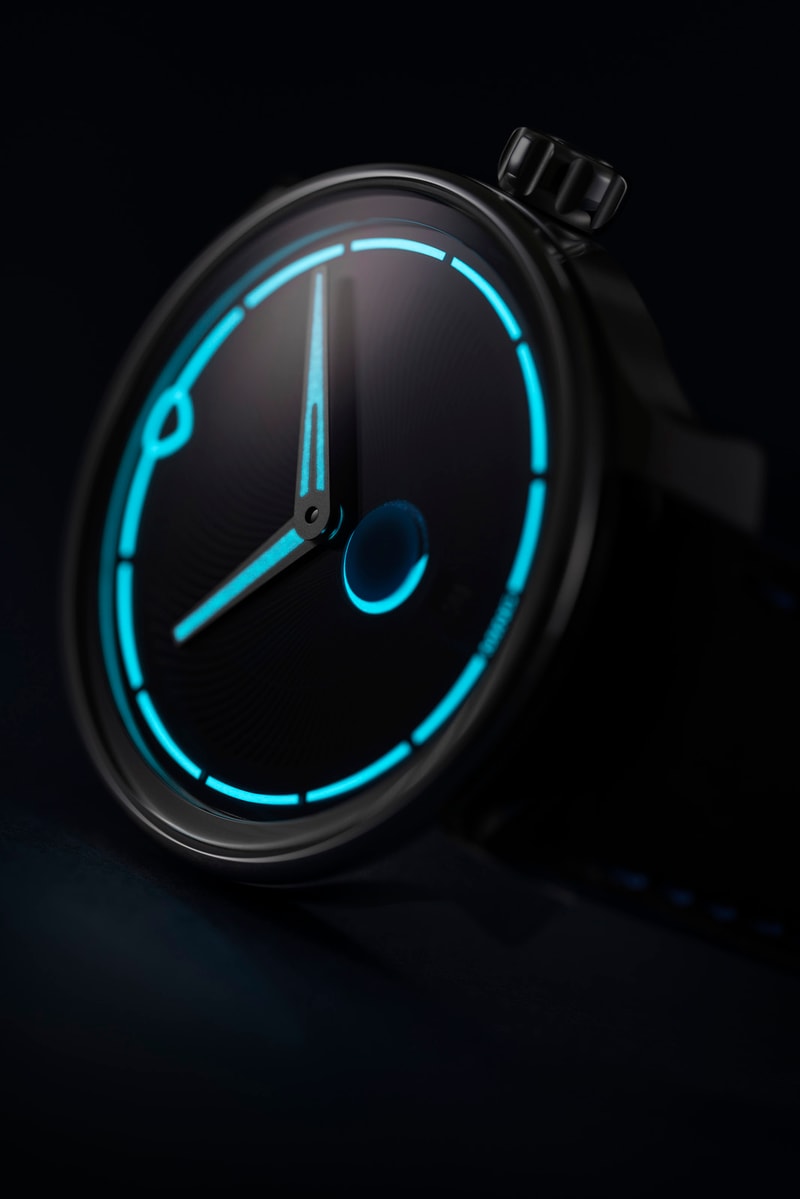 Of course, being us, we scrutinized both moon and date to figure out a smoother presentation than the usual holes-in-a-dial style that was more suited to our design language. Our continuing use of multi-layered sapphire dials offered a solution: the apertures for date and moon lie in the lower layer dial, which is metal, textured and carries a midnight blue to black gradient reminiscent of the night sky, with a seamless sapphire dial above that carries the hour indices (laser etched, and filled with HyCeram) and a central mask for the moon to mirror our peripheral ring forms. A full moon thus forms a complete ring, which is luminous, with partial phases being portions thereof. The date window preserves symmetry at 6 o’clock, and is as subtle as possible with a background color-matched to the dial, and our usual font in light grey.