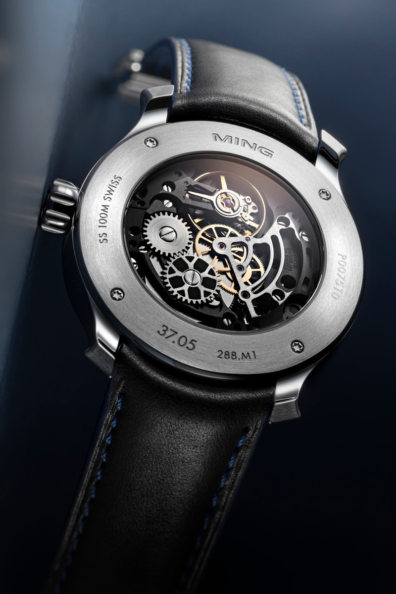 We knew we didn’t want the semicircle moon aperture, but what we had in mind would require a centrally-driven moon disc to offer a sufficiently large display to allow the ring display to work. Only a custom module or the Sellita SW288 offered this possibility, and selection of the latter allowed us to improve overall accessibility of the watch. But to make it worthy of a display back, it was then further reworked in a similar style to the 7001.M1 used in the 27.01 and 27.02; it is skeletonized, matte-blasted and anthracite coated, with a contrasting portion on the main train bridge in circular-brushed rhodium.