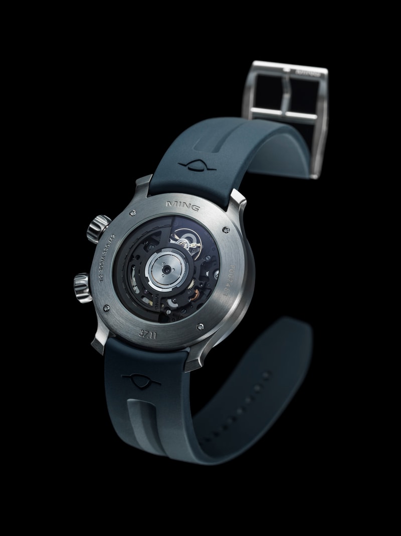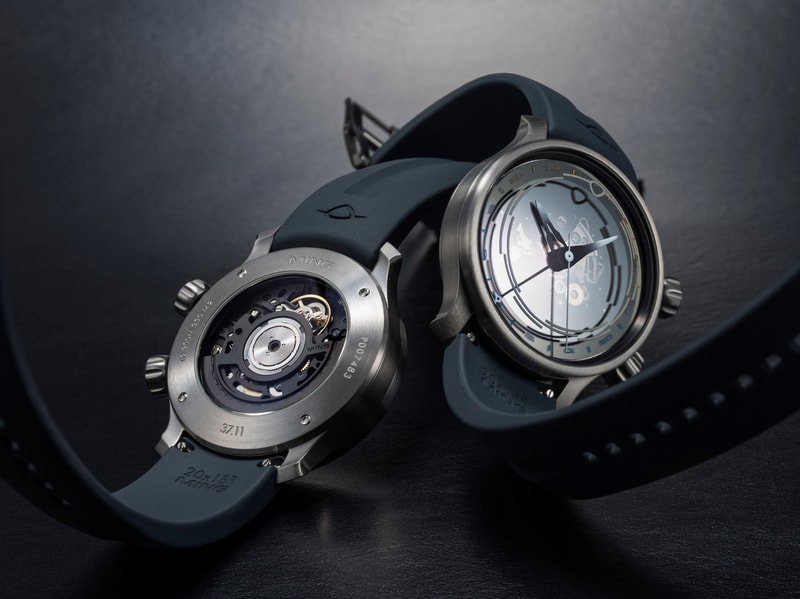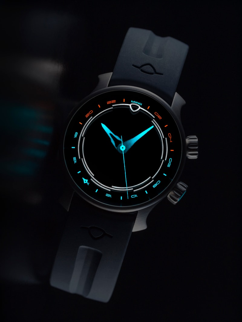 A diver for those who like to explore. It shares the GPHG-winning 37.09 Bluefin’s pressure balanced case architecture, but now with a GMT movement and in pure (grade 2) titanium that can be paired with a matching bracelet or our revolutionary MING Polymesh to make for a lightweight travel companion. The watch head now weighs a hair over 42 grams and has a brushed finish that lends it a sporty aesthetic.