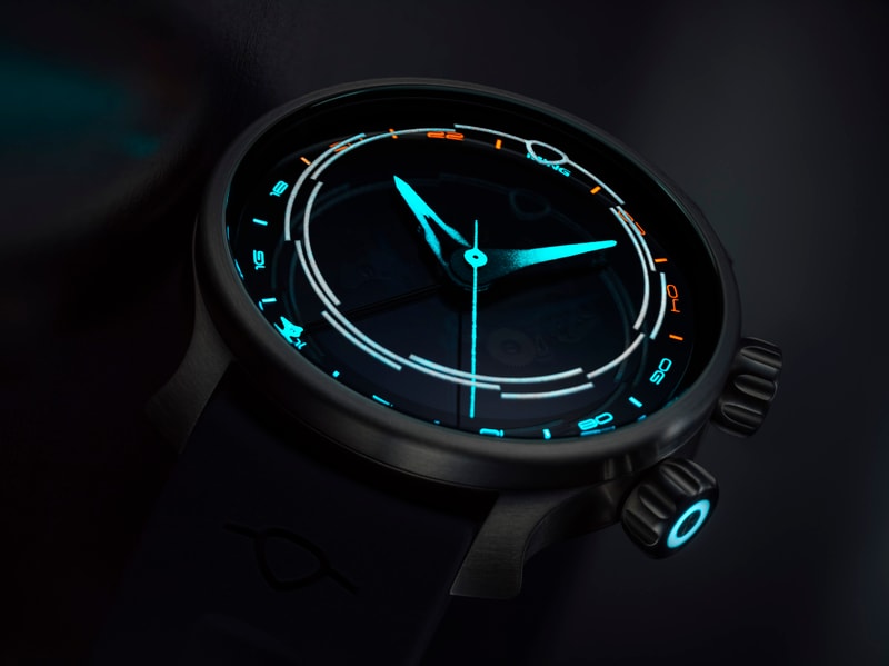 The winding/setting crown at 2 o’clock screws down for water resistance and has an unlocked warning indicator. Both crowns are also colour coded and luminous, because, why not?