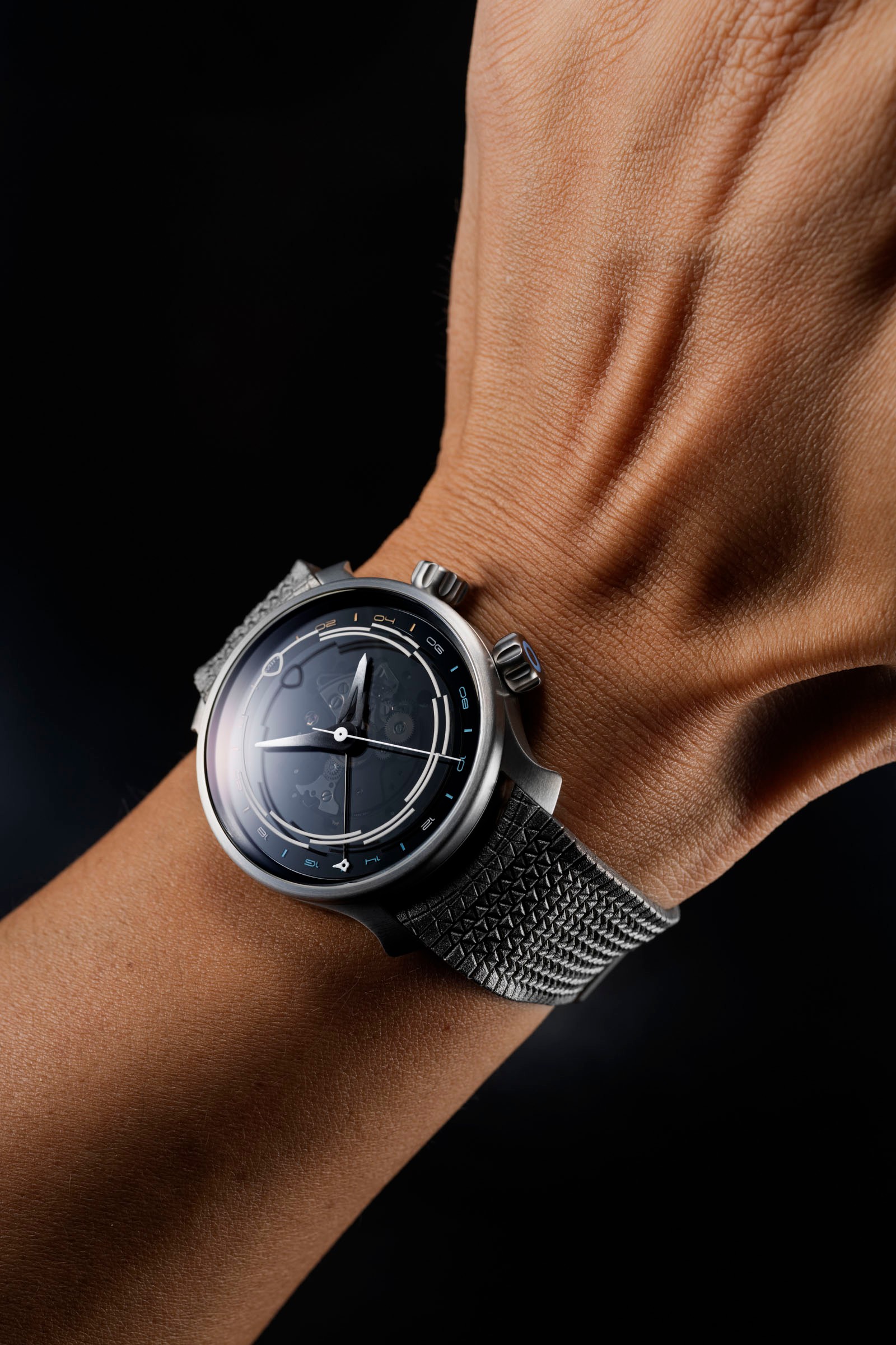 We’ve retained the rotating dial – the engineering solution that allowed Bluefin to have the same visual prominence of much larger dive watches whilst retaining the wearability of the 38mm case. Given the Odyssey’s inspiration and name however, the dial is bidirectional and 24-clicks for each of the 24 timezones. The Odyssey has a smoked sapphire dial, which teases and hints at the movement underneath, and the 24-hour markings are not only luminous but also colour coded for the day-night indication. Orange for after dark, and blue for daytime.