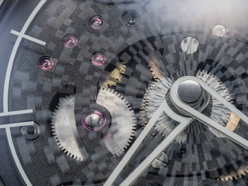 We inadvertently made life difficult for ourselves with the first mosaic because of the radial symmetry: notice how all of the lines converge at the center, which created a hot spot and thus necessitated reducing opacity to prevent cracking. The second generation mosaic is intended to both be visually different as well as reduce overall stresses on the crystal – which is why it’s a semi-random diffuse pattern that has no ‘center’, but which allows us to overlay multiple layers to create even more of a three dimensional effect – which can be further enhanced by a uniform dark background. A bonus effect with all of the mosaics is that they pick up and scatter light from the HyCeram luminous material embedded in the dial indices, even though the mosaic itself is not luminous (there is simply no way to get luminous material into the micro-cavities as they’re self-contained and sealed).
