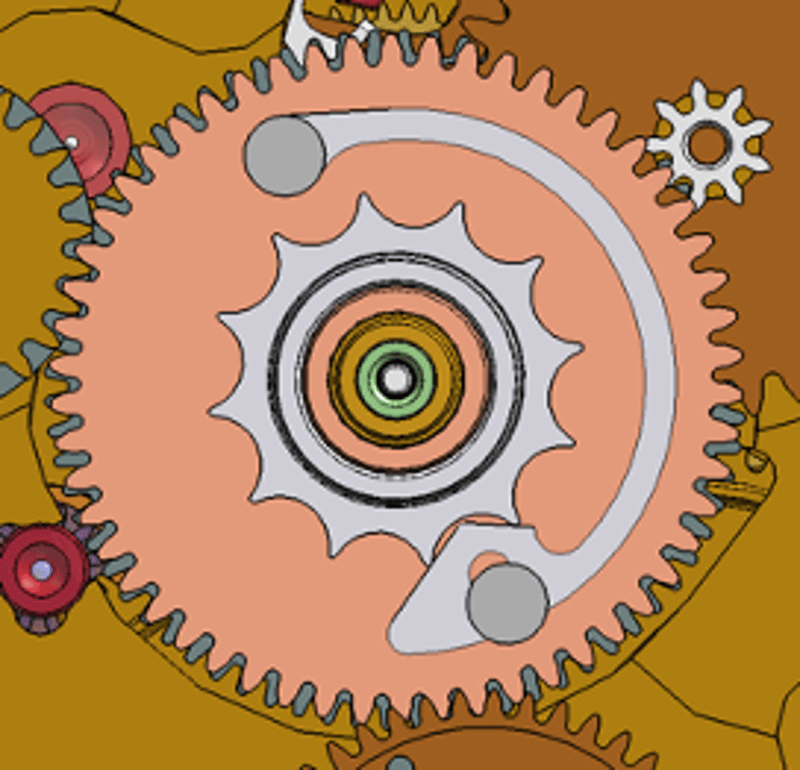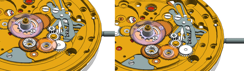 As it turns out…there were some undocumented changes and these affected both the tension of the GMT and setting mechanisms. This was the underlying cause of the alignment issues affecting some of the early 17.09s: firstly, if not backwound half a turn to disengage the switching rocker (bottom white round gear in illustrations below), the setting gear would cause drag on the 24/12h hand causing it to lag. In these cases, resetting the time but turning the crown one revolution in the second position to disengage the independent hour mechanism before pushing it back in would solve the problem.