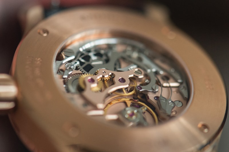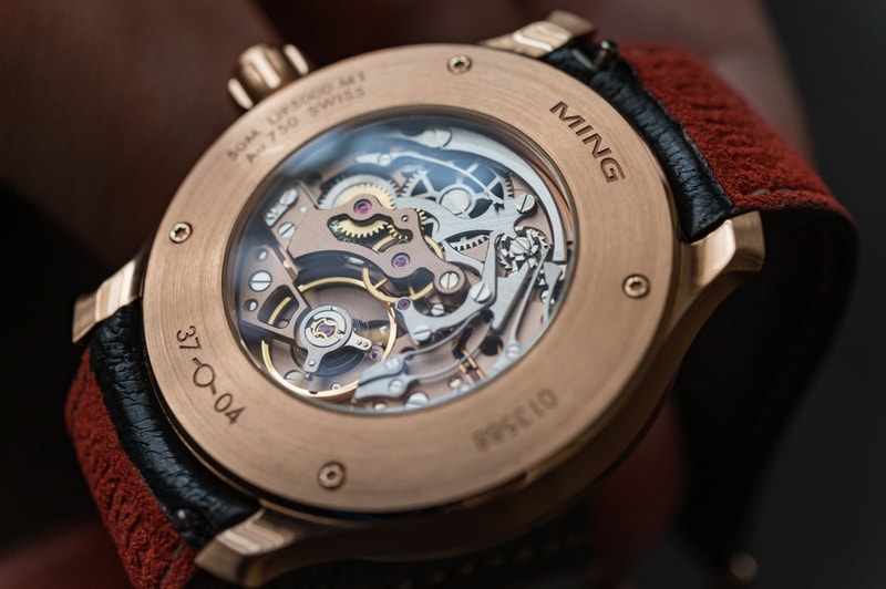 In addition to refurbishing the movements, MT also reworked the bridges to update the movement to fit the MING design language. Our version of the LJP has some skeletonised bridges, is treated to a 5N rose gold finish, and features our signature barrel wheel design.