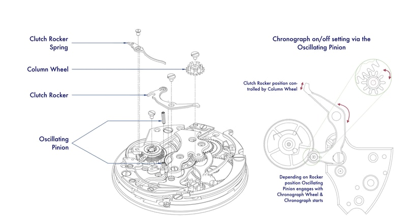 The oscillating pinion replaces the coupling wheel found in conventional chronographs and saves space in three distinct ways: