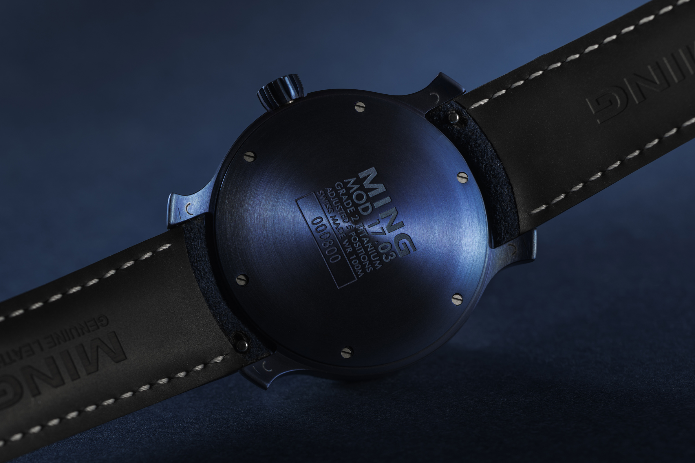 The Ultra Blue features a titanium case individually heat blued in house by Ming Thein. Each case is unique due to the nature of the process; they show hints of purple, cyan and dark blue and continuously change character when handled. The crown is engraved by hand. We fitted a new sunburst metallic blue dial, together with an updated sapphire ring and new satin beadblasted hands filled with Super-LumiNova. Finally, the watch is completed with a handmade dark blue alcantara strap by Jean Rousseau Paris, and matching heat-blued titanium pin buckle.